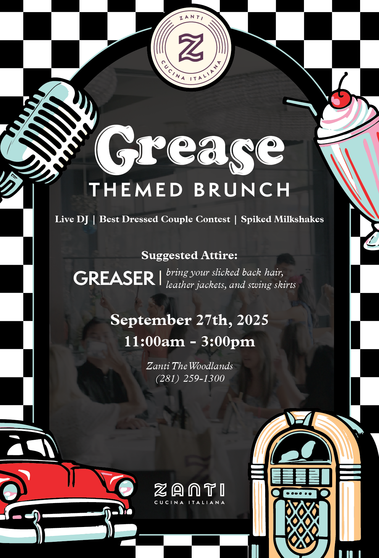 Word around the lockers is Zanti’s throwin’ the best brunch this side of the jukebox. Step into the 1950s as The Woodlands’ favorite spot transforms into a Grease-inspired party. We’re talkin’ spiked milkshakes, brunch favorites, best dressed contest, and a DJ spinning rock ’n’ roll hits to keep you hand-jivin’ ‘til the last mimosa.